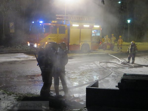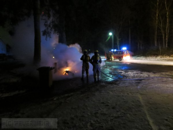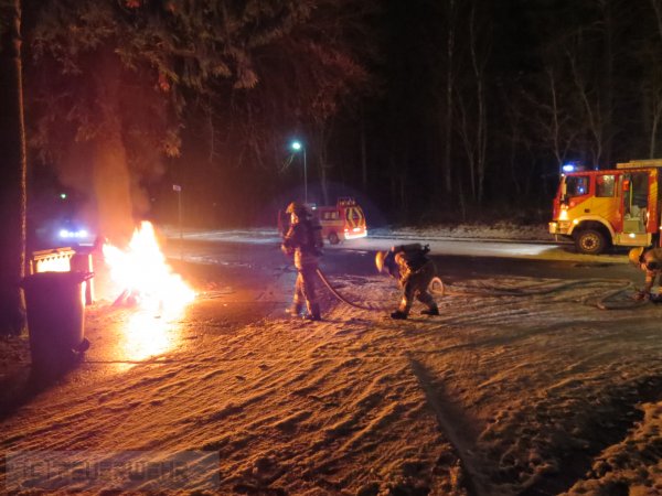 Aus bisher unbekannten Gründen geriet ein Müllbehälter mit Altpapier in Brand. Unter schweren Atemschutz wurde dieser mit einem C-Strahlrohr gelöscht