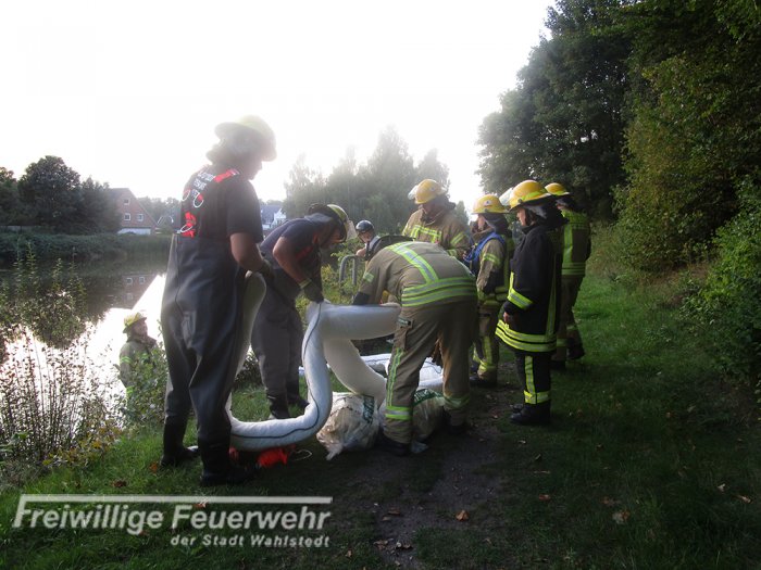 Im Rahmen der Amtshilfe alarmierte Gemeindewehrführer Jörg Neubauer die Feuerwehr mit dem Stichwort „Öl auf Gewässer“. Aufgrund des geringen, vermutlichen, Ölfilmes konnte nicht die gesamte Menge aufgenommen werden. Um eine weitere Ausbreitung zu verhindern, wurde vor dem der Straßeneinlauf eine Ölsperre gelegt, sowie schwimmfähiges Ölbindemittel ausgestreut. Nach der Entnahme einer Wasserprobe konnte der Einsatz beendet werden, und wurde an den Betreiber übergeben.