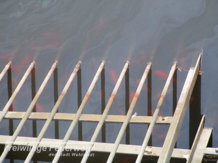 Ein aufmerksamer Passant bemerkte einen größeren Ölfilm in einem Regenrückhaltebecken und wählte den Notruf. Über einen straßenseitigen Einlauf kam es zu der Verunreinigung des Gewässers. Unter Hinzuziehung der Betreibers, Zweckverband Mittelzentrum, wurde um Amtshilfe der Feuerwehr gebeten.