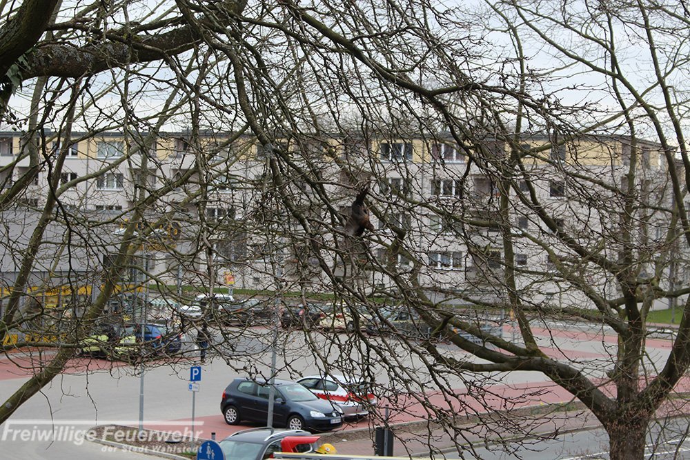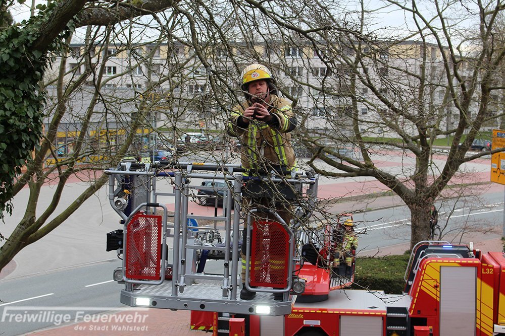 Vermutlich hat sich die Amsel auf dem Boden in einer Schnur verfangen, die ihr bei der Landung auf dem Ast in ca. fünf Meter Höhe zum Verhängnis wurde. Neben Neubauer rückten die Feuerwehrmänner Frank Möller und Patric Siewers mit der Drehleiter aus. Um die Amsel aus ihrer misslichen Lage zu befreien, musste zunächst der Ast abgebrochen werden, um die Schnur von der Kralle entfernen.