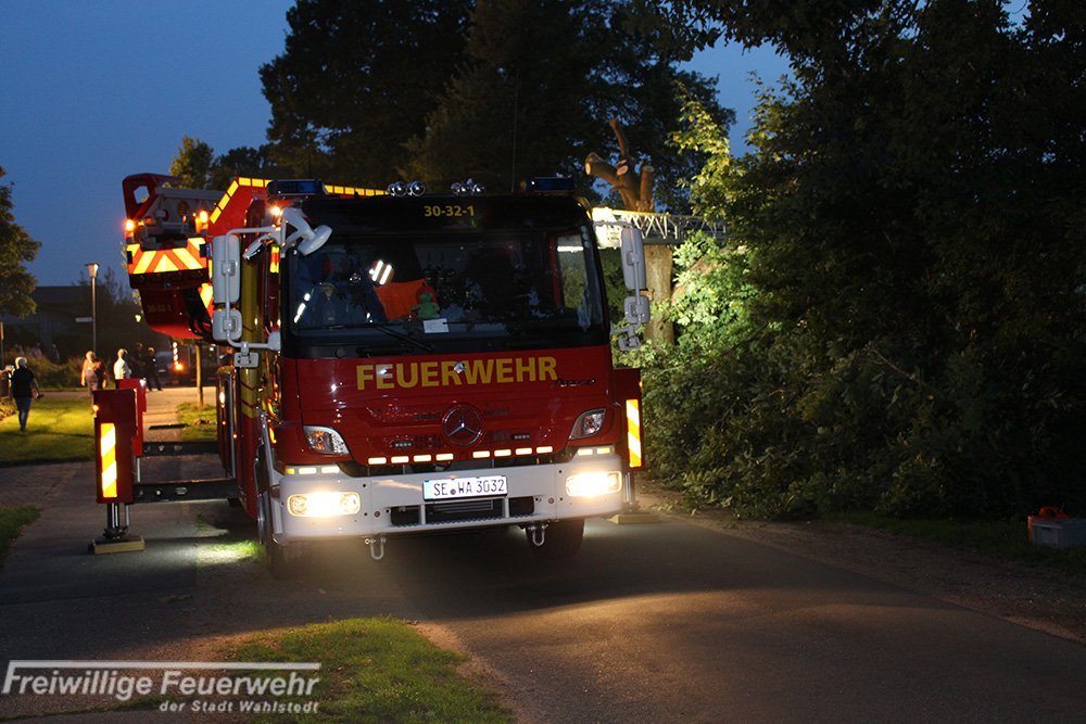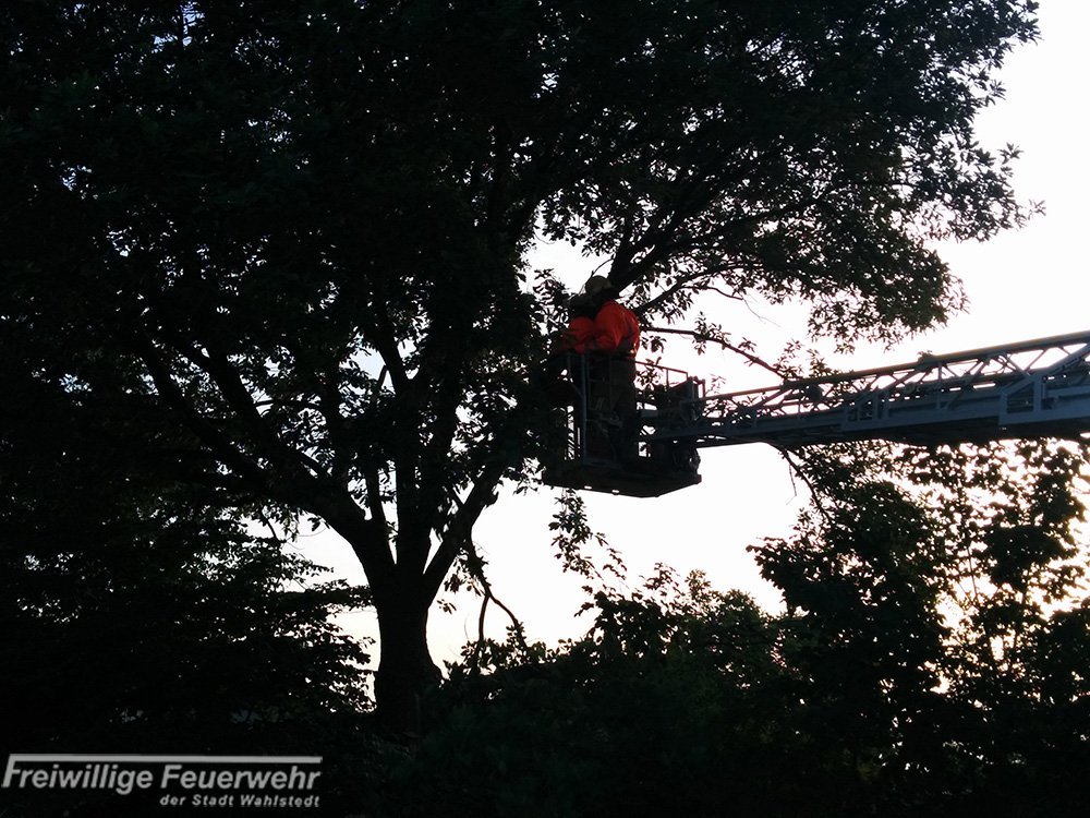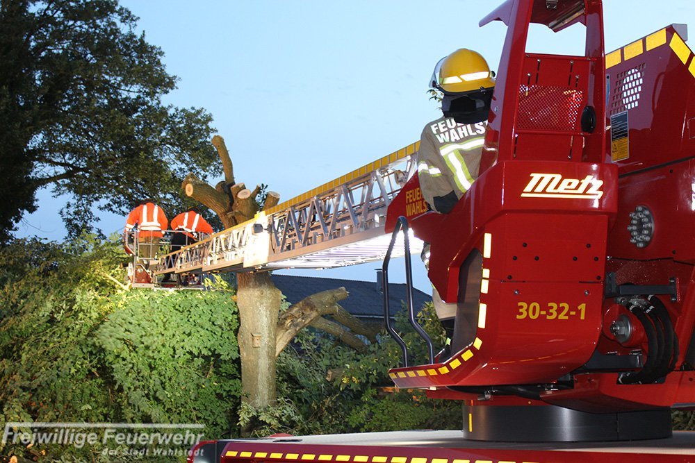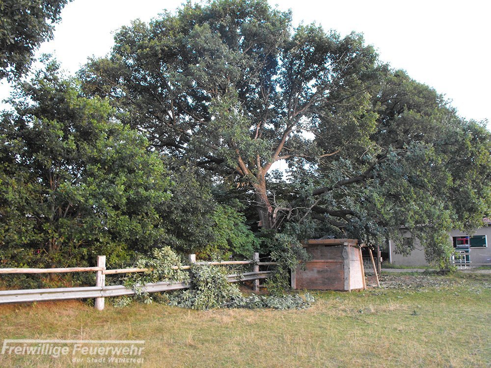 Eine eventuell durch einen Blitz getroffene Eiche drohte heute gegen 19 Uhr auf die Straße zu fallen. Mehrere heruntergefallene Äste hatten einen benachbarten Unterstand bereits beschädigt. Vom Drehleiterkorb aus wurde die Baumkrone abgetragen.