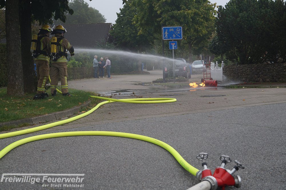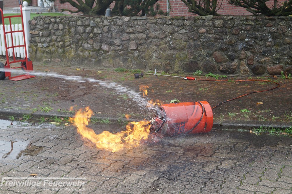 Beim Zusammensetzen eines Gasbrenners löste sich unbewusst das Gasflaschenventil, wodurch Gas ausströmte. Beim Anzünden des Brenners entzündete sich das Gas und brannte aus der Flasche heraus. Durch den Anwohner wurden bereits erste Kühlungsmaßnahmen bis zum Eintreffen der Feuerwehr unternommen.