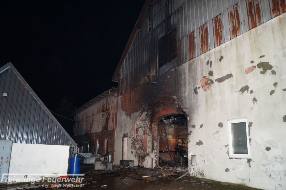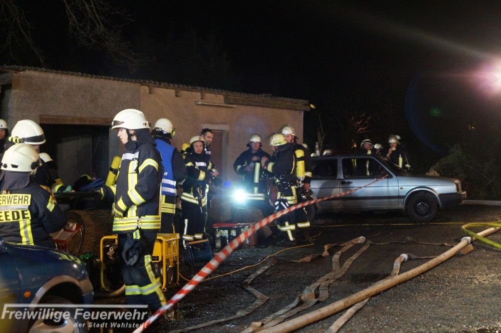 An der Einsatzstelle kam es zu einem Garagenbrand, der sich nach einer Durchzündung auf das gesamte landwirtschaftliche Gebäude ausbreitete.