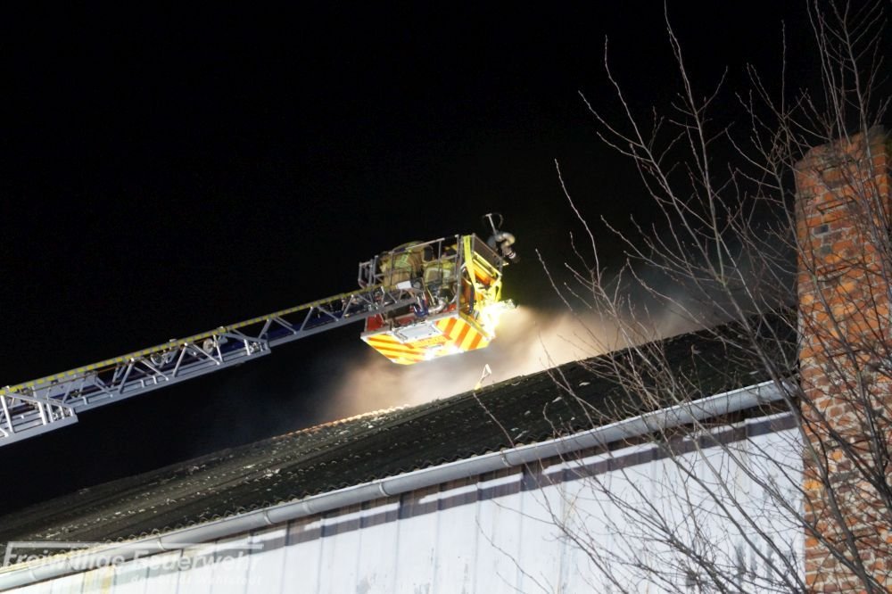 Nachdem Teile des Daches weiträumig entfernt wurden, konnte der Innenangriff durch die Feuerwehren fortgesetzt werden.