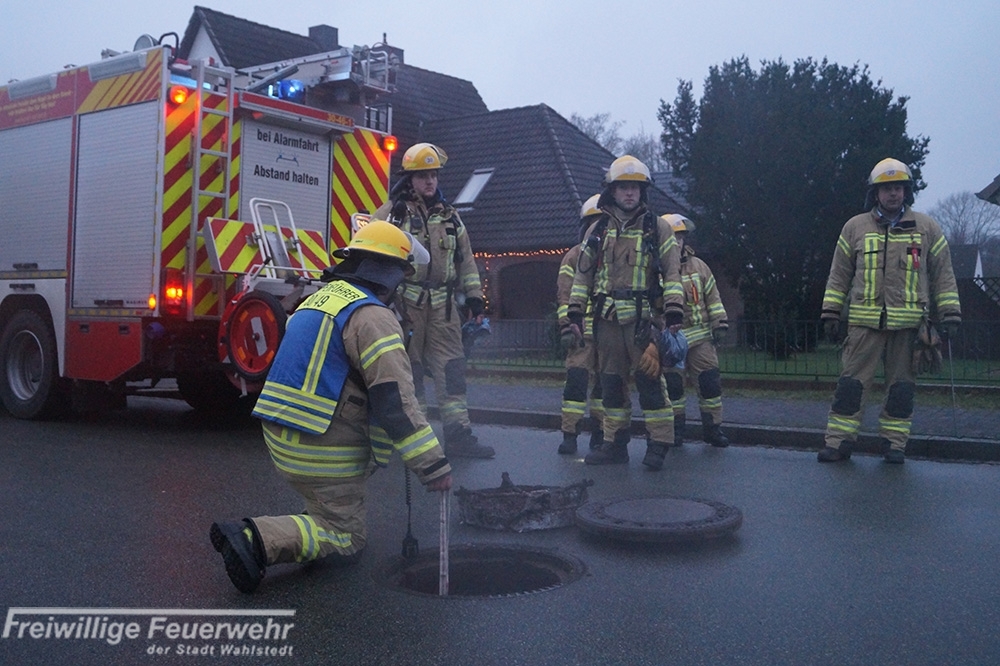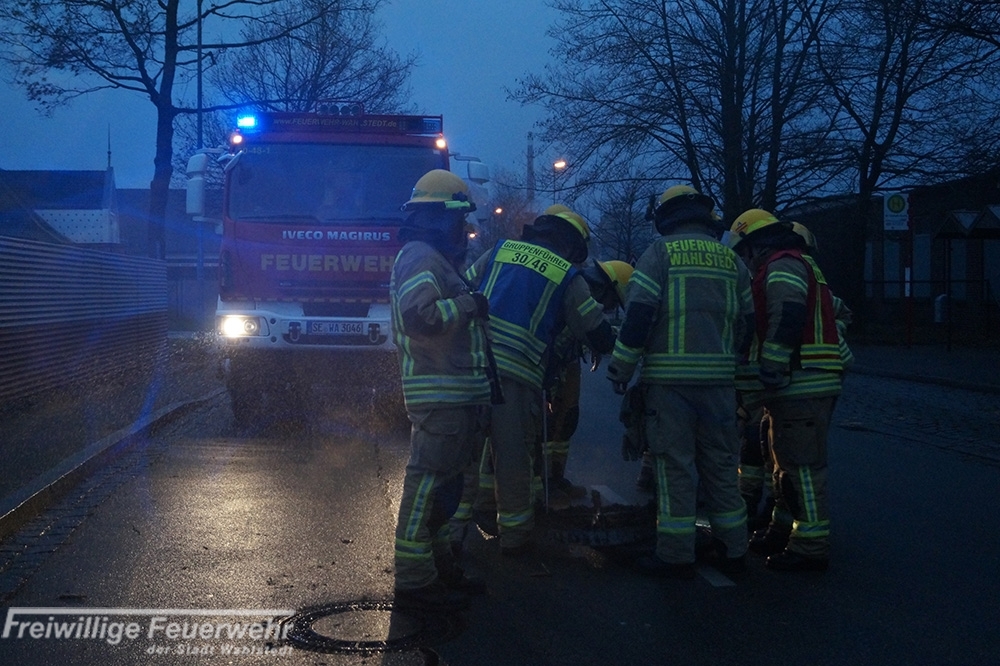 Aus ungeklärter Ursache kam es zu einer deutlichen Rauchentwicklung aus dem Kanalsystem in der Waldstraße. Da nicht auszuschließen war, dass es mit Kühlungsmaßnahmen eines Wahlstedter Betriebes zu tun hat, kontrollierte die Feuerwehr mit der Wärmebildkamera und einem Multi-Gasmessgerät die Kanaleingänge.
