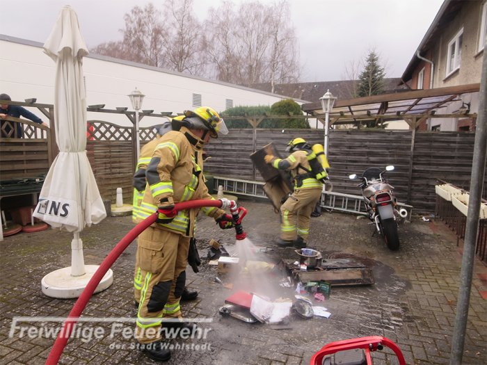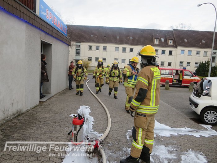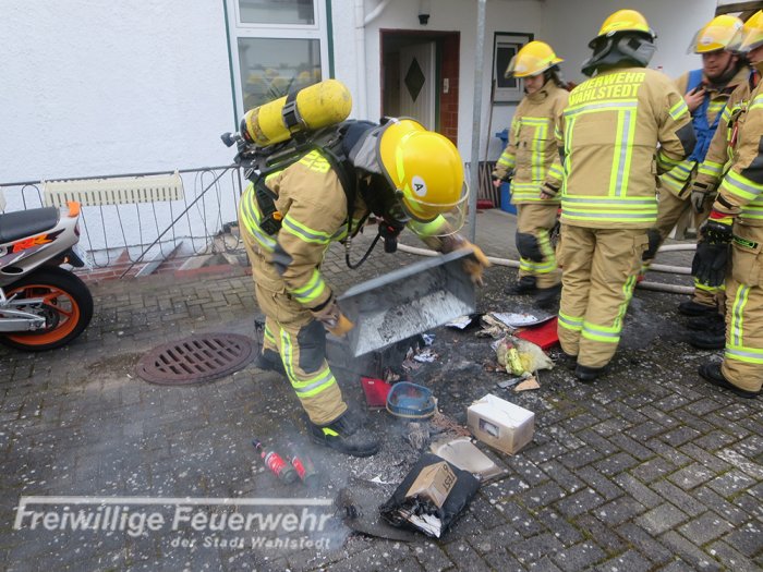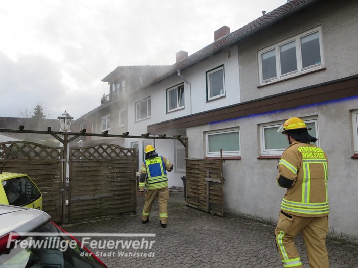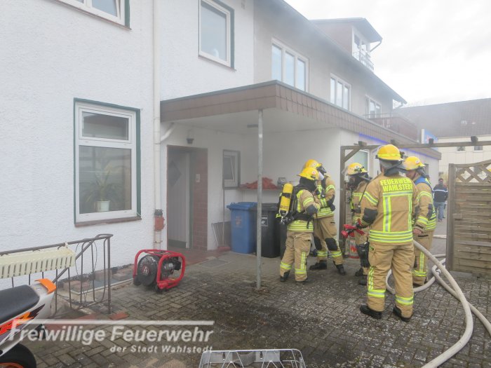 Beim Eintreffen der Feuerwehr an der Einsatzstelle drang Rauch aus zwei Seiten des Gebäudes. Die Feuerwehr setzte einen 3-Mann Atemschutztrupp mit Kleinlöschgerät zur Brandbekämpfung ein. Parallel wurde ein Löschangriff aufgebaut, ein Hochleistungslüfter in den Einsatz gebracht und ein Atemschutzsicherungstrupp ging in Bereitstellung. Es wurde festgestellt, dass vermutlich durch eine heiße Herdplatte, während der Zubereitung einer Mahlzeit, Gegenstände die auf und neben dem Herd standen, Feuer fingen. Die brennenden Gegenstände wurden durch den Atemschutztrupp ins Freie gebracht und abgelöscht. Abschließend wurde die Küche mit der Wärmebildkamera kontrolliert.