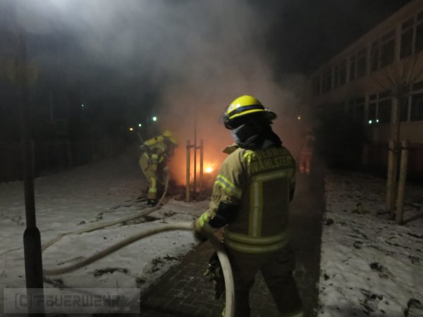Aus bisher unbekannten Gründen geriet ein Müllbehälter mit Altpapier in Brand. Unter schweren Atemschutz wurde dieser mit einem C-Strahlrohr gelöscht