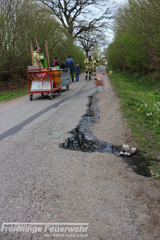 Aus bisher ungeklärter Ursache wurden an zwei verschiedenen Stellen in der Hans-Dall-Straße zwei mit Öl gefüllte Kanister abgestellt und umgekippt. Es liefen ca. 25 Liter Öl auf die Straße, die von der Feuerwehr mit sieben Säcken Ölbindemittel abgestreut wurden. Anschließend wurde das Bindemittel zwecks Entsorgung wieder aufgenommen.