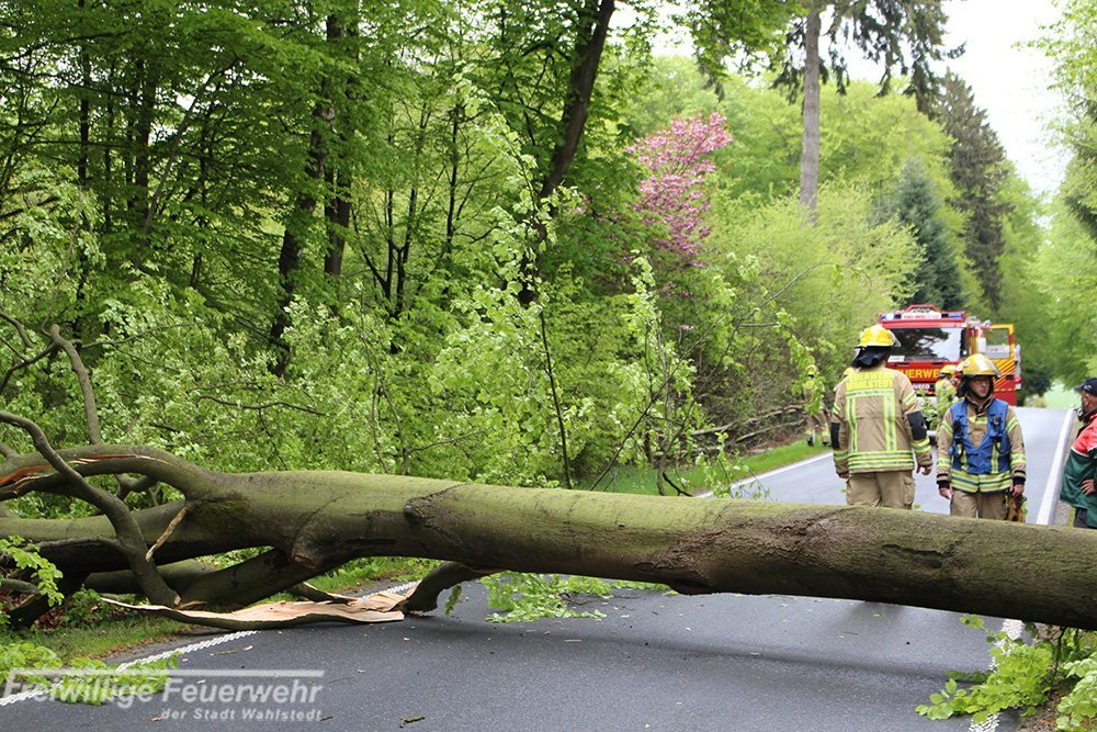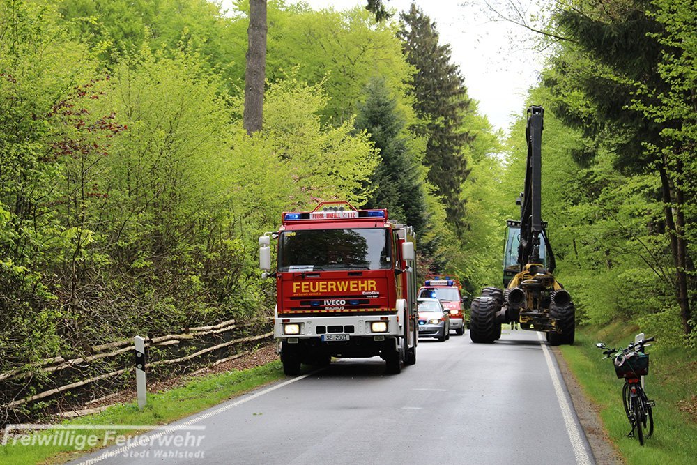 Ein umgestürzter Baum auf der K 102 veranlasste einen Spaziergänger den Notruf zu wählen. Kurz nach Eintreffen der Feuerwehr, traf ein Mitarbeiter der Landesforstverwaltung ein und teilte dem Einsatzleiter mit, dass er bereits einen Harvester (Vollernter), der in der Nähe tätig ist, an die Einsatzstelle bestellt hat.