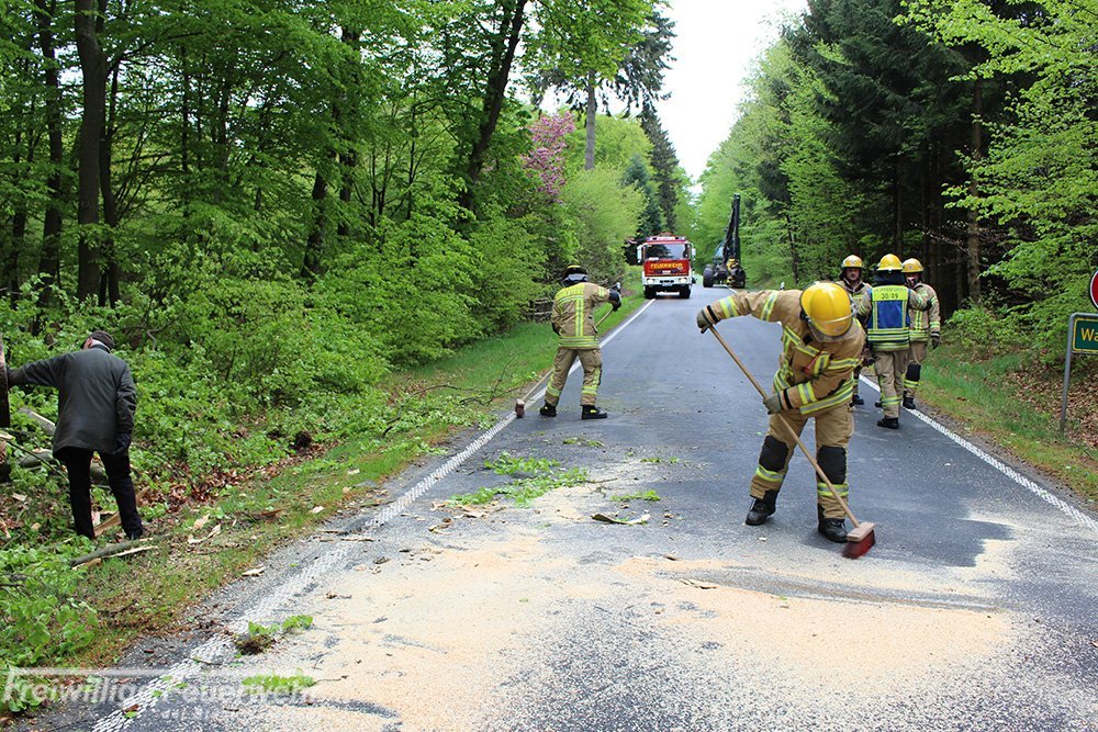 Bis zum Eintreffen des Harvester sperrte die Feuerwehr die Straße. Nach dem der Baum beseitigt war, wurde die Straße von den den Einsatzkräften grob gereinigt. Anschließend rückte die Feuerwehr ein.
