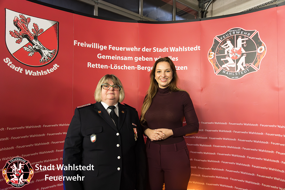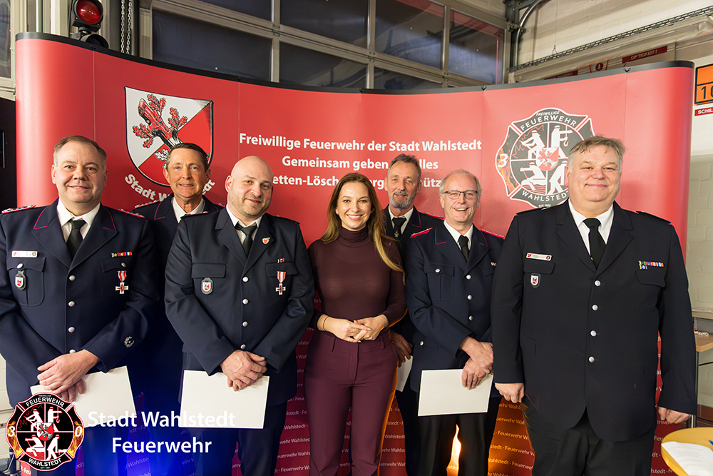 Im weiteren Verlauf der Tagesordnung übergab der Gemeindewehrführer das Wort an Magdalena Finke. In Ihren Grußworten lobte die Innenministerin den Zusammenhalt in der Feuerwehr Wahlstedt. Anschließend übernahm Sie die Ehrung mit dem Schleswig-Holsteinischen Brandschutz-Ehrenzeichen in Silber für 25 Jahre aktiven Feuerwehrdienst an Norbert Zessin, Daniel Bartsch, Andre Klitzing, David Sill und Torsten Thieme. Ebenso ehrte sie Corinna Lepping-Veermans sowie einen weiteren Kameraden mit dem Schleswig-Holsteinischen Brandschutz-Ehrenzeichen in Gold für 40 Jahre aktiven Feuerwehrdienst. „Ich bin unglaublich stolz auf euch.“, betont die Innenministerin.